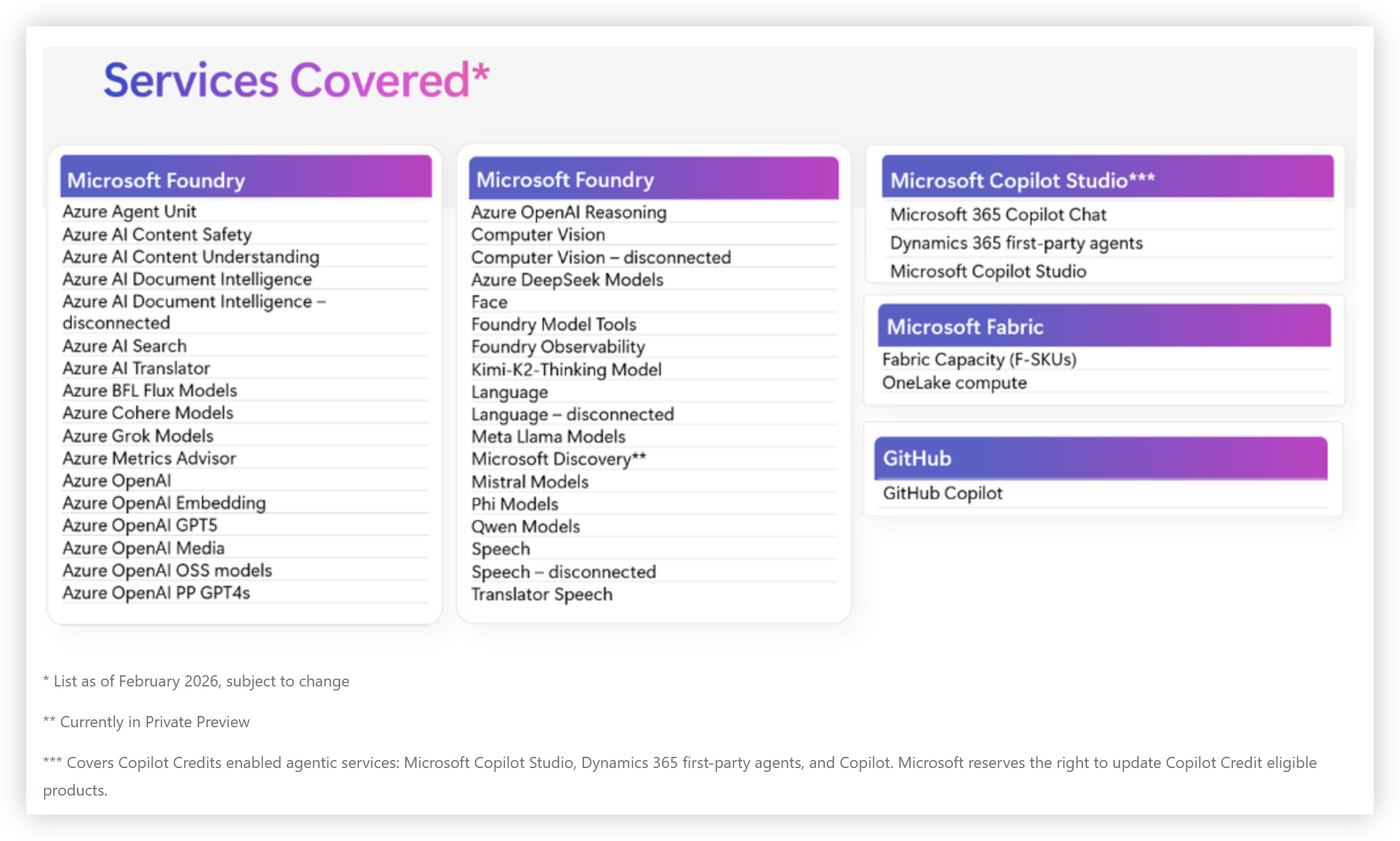 Microsoft announced the availability of the Agent Pre-Purchase Plan in November 2025. This is a new type of Azure Reservation that enables customers to have a single pool of funds that can be used to pay for both Copilot Credits and Microsoft Foundry costs, as well as (from February 2026) Microsoft Fabric and GitHub Copilot. You buy Agent Commit Units (ACUs) in one of three tiers, with discounted pricing, and then have a year to use the ACUs over this wide range of services. There’s information about the tiers and the services covered here, and some useful licensing examples in the Learn documentation.