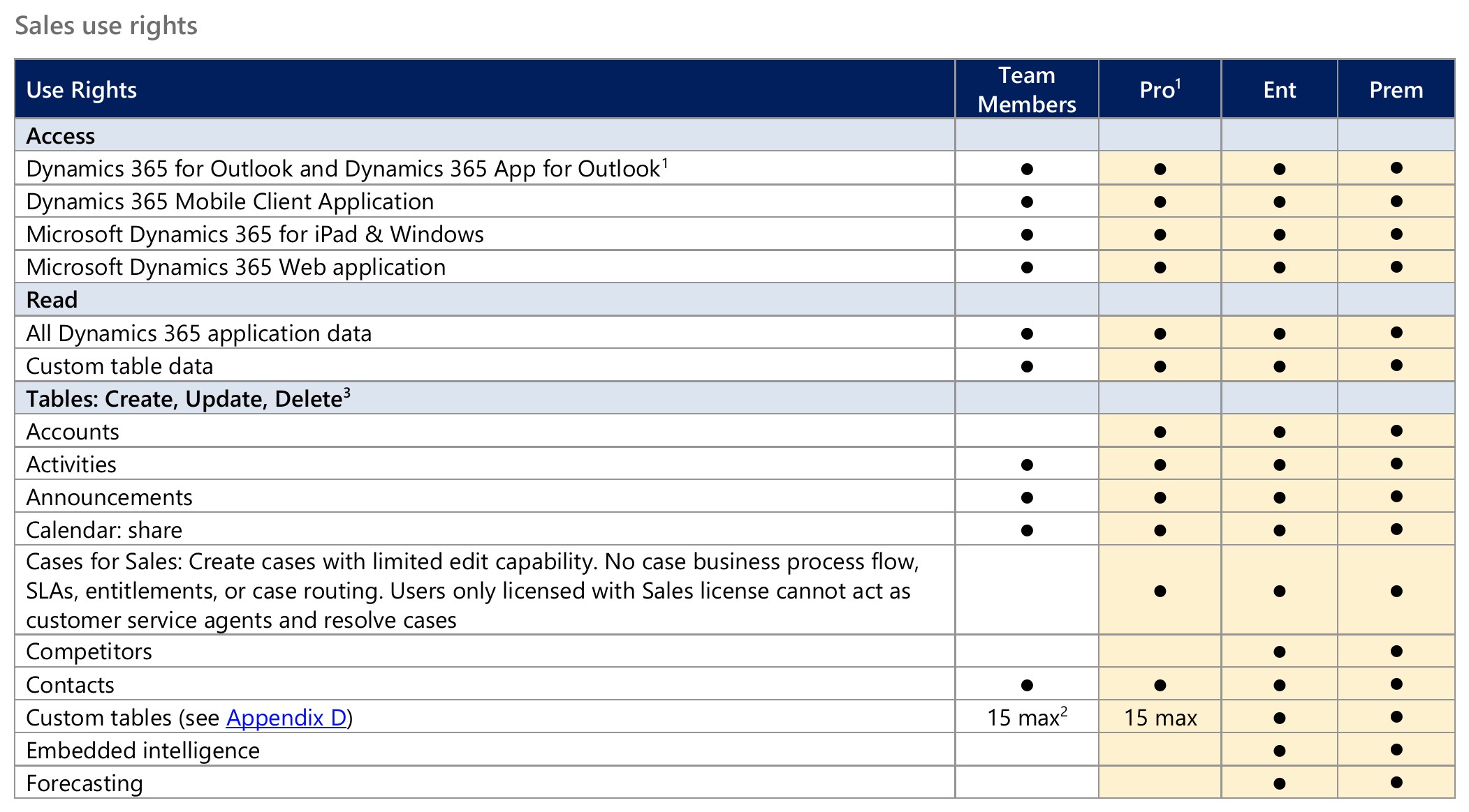 The snippet below is the top part of a useful table that you can find in the Dynamics 365 Licensing Guide which helps you to choose the right license for an individual – search for “Sales use rights”: